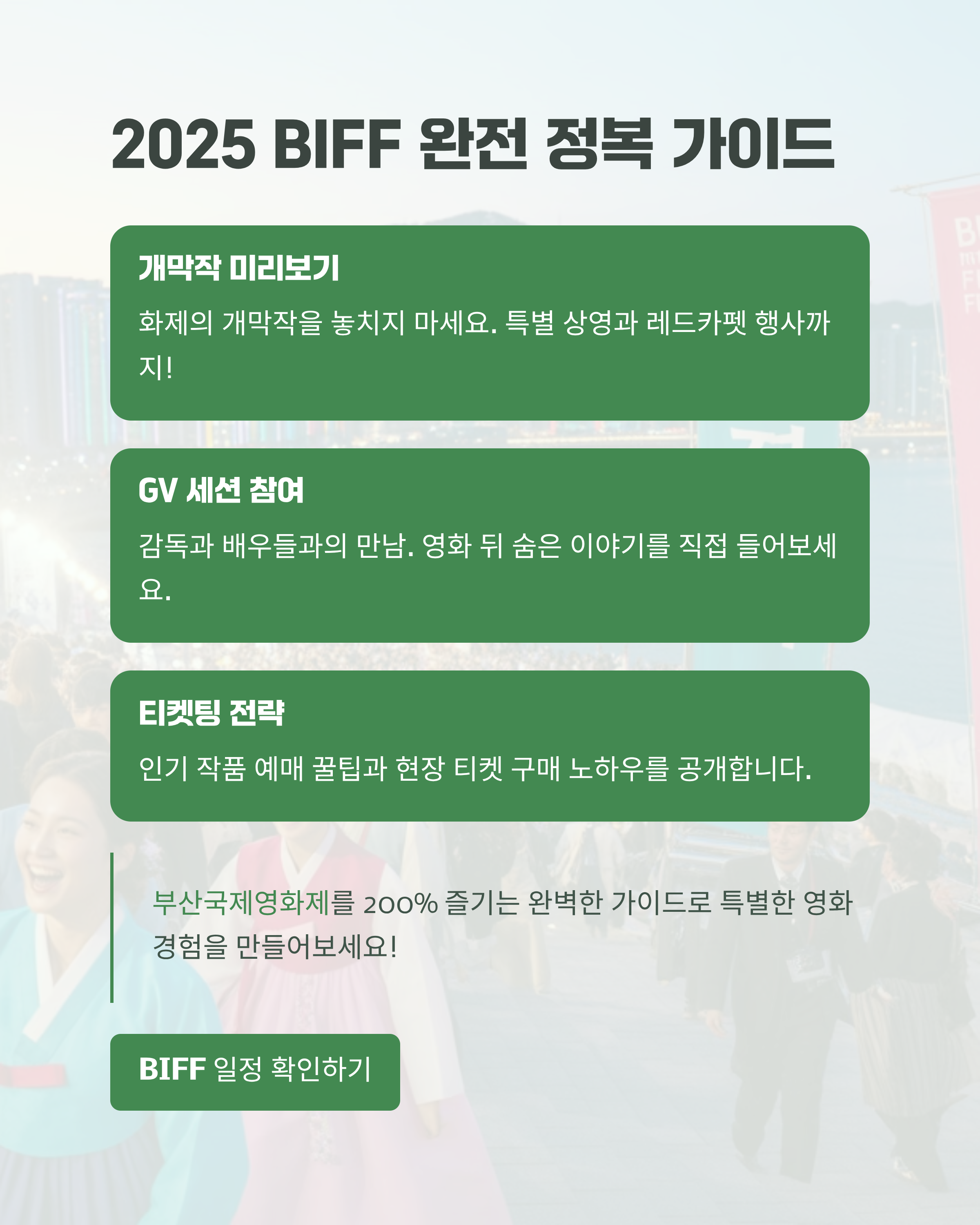 이번 포스팅에서는 2025년 부산국제영화제를 완벽하게 즐기기 위한 모든 정보를 총정리하여 여러분께 상세히 전달해 드리겠습니다. 예매 방법부터 개막작, GV 일정, 그리고 주차 꿀팁까지, 알찬 정보들을 꼼꼼하게 준비했으니, 영화제 방문을 계획하고 계신 분들께 많은 도움이 되리라 생각합니다.